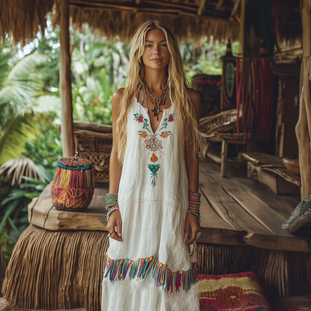 Bohemian Floral Embroidery Tassel Art Sleeveless Cozy Linen Maxi Dress