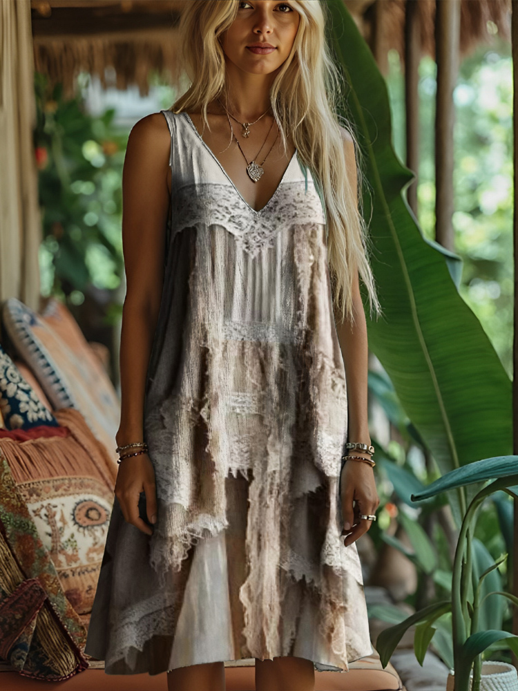 Bohemian Lace Patchwork Art Women's Linen Vest Dress
