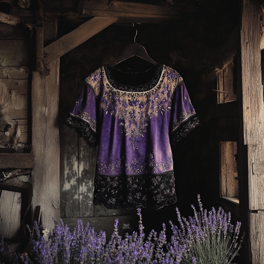Bohemian Lavender Embroidery Gradient Patchwork Art Linen Short Sleeve T-shirt