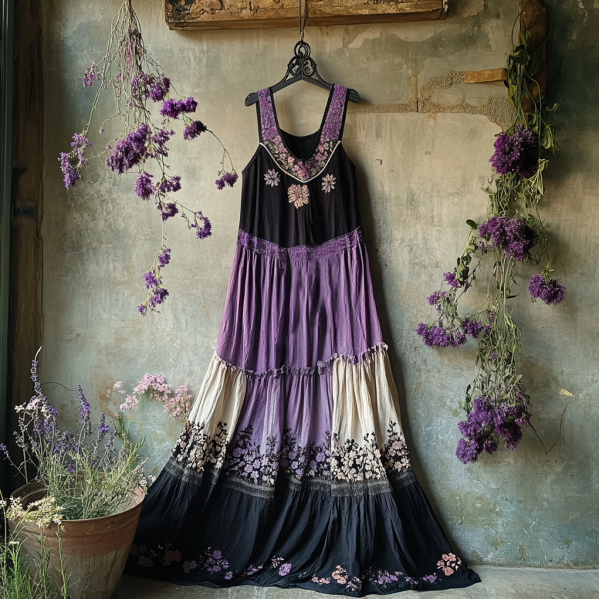Bohemian Lavender Embroidery Patchwork Art Sleeveless Cozy Linen Maxi Dress