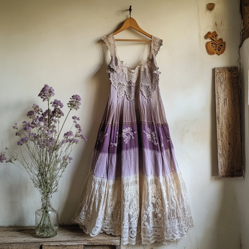Boho Lavender Embroidered Pattern Lace Linen Dress