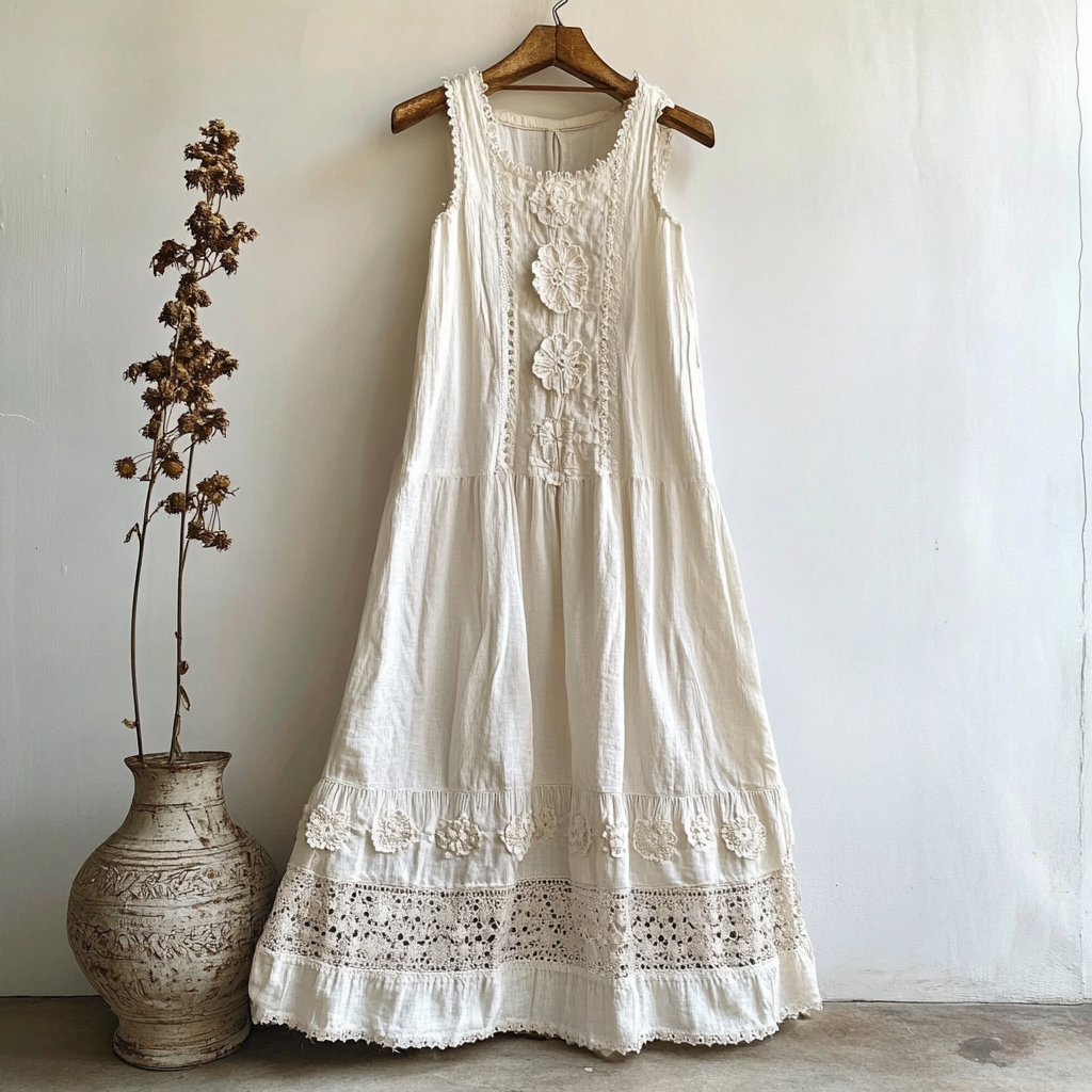 Elegant Floral Lace Cutout Design Linen Sleeveless Dress