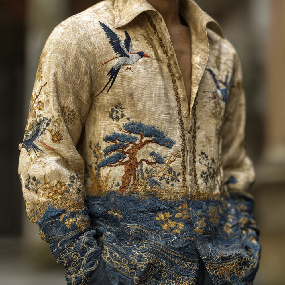 Japanese Bird And Flower Embroidery Art Men's Linen Long Sleeve Shirt