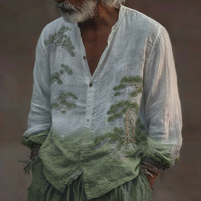 Men's Vintage Pine Tree Art Pattern Linen Blend Shirt