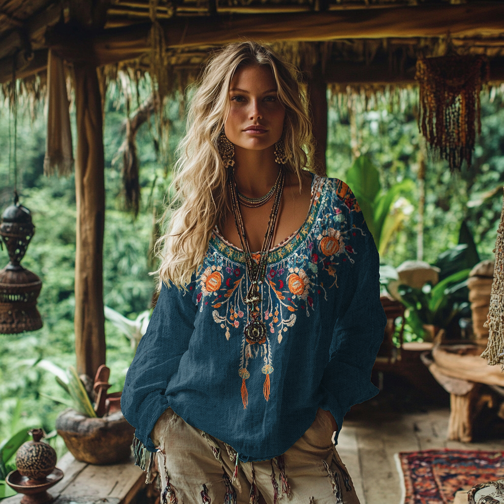 Vintage Bohemian Floral Embroidery Linen Blend Shirt