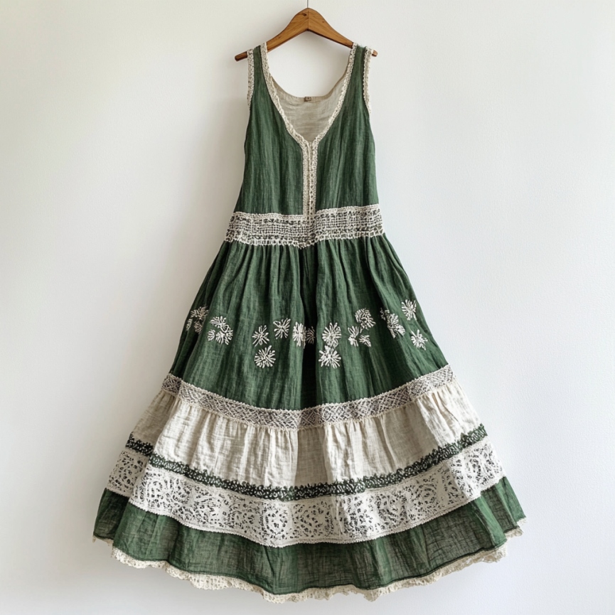 Vintage Lace Flowers Art Linen V Dress