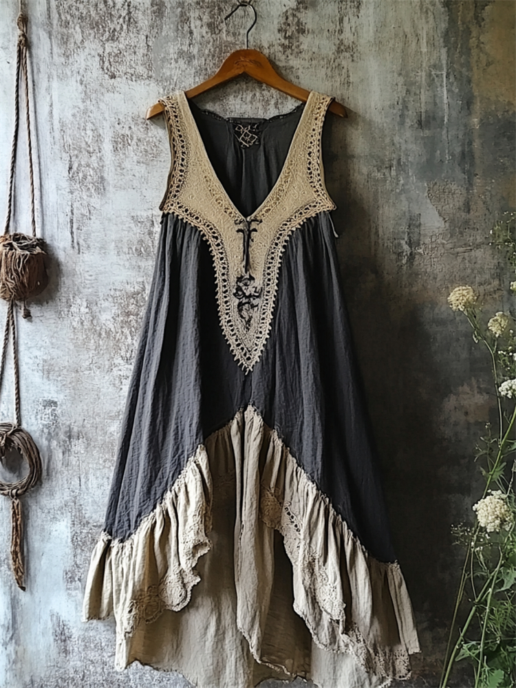 Vintage Lace Patchwork Ruffle Bottom Linen Tank Dress
