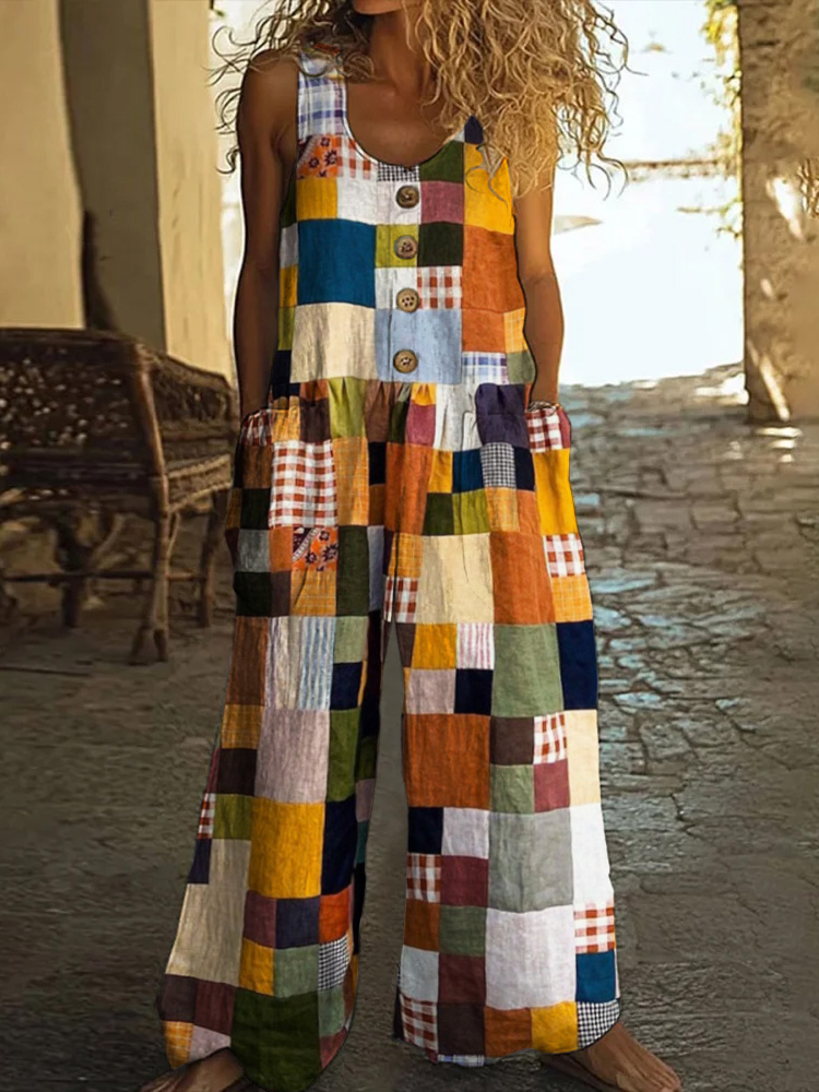 Vintage Square Patchwork Boho Art Women's Linen Wide Leg Jumpsuit