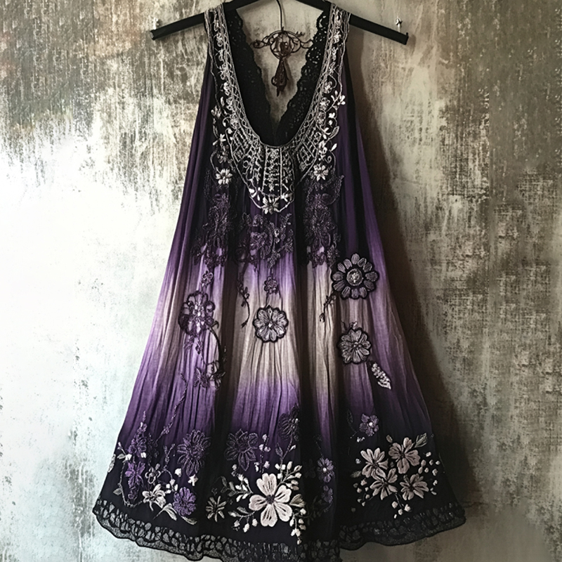 Vintage Tribal Embroidered Floral Lace Patchwork Art Linen Dress