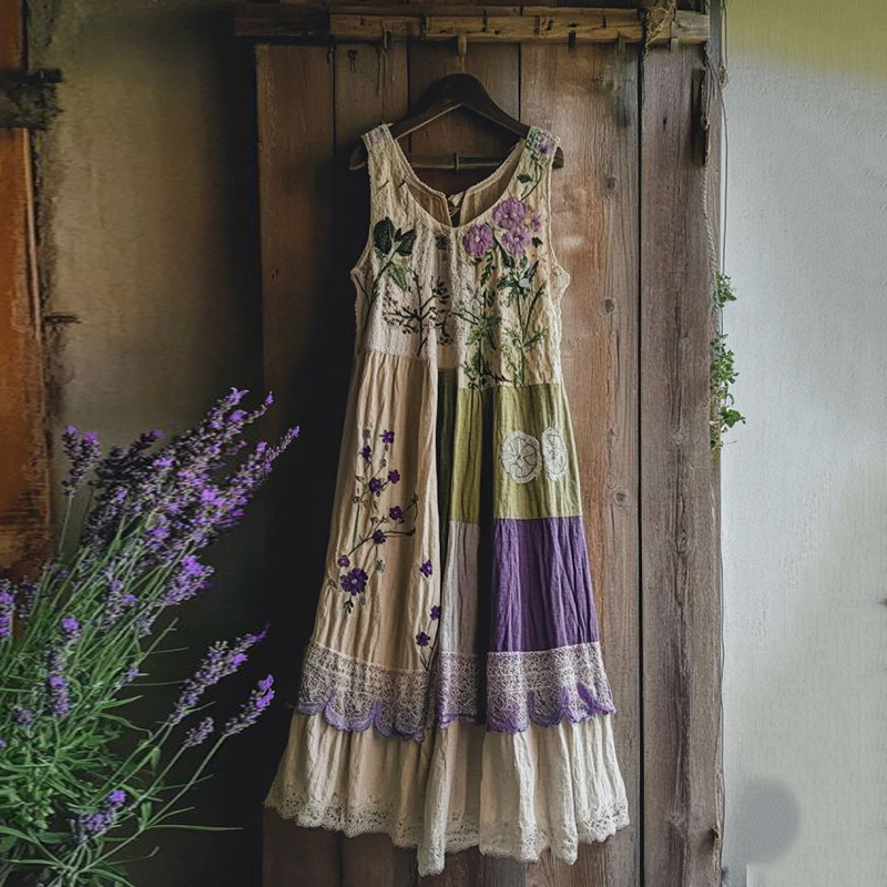 Vintage Tribal Embroidered Violet Lace Floral Art Linen Dress