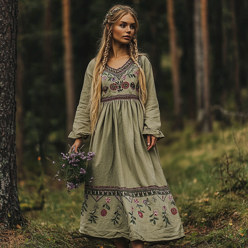 Women's Vintage Cotton Linen V-neck Embroidered Floral Dress
