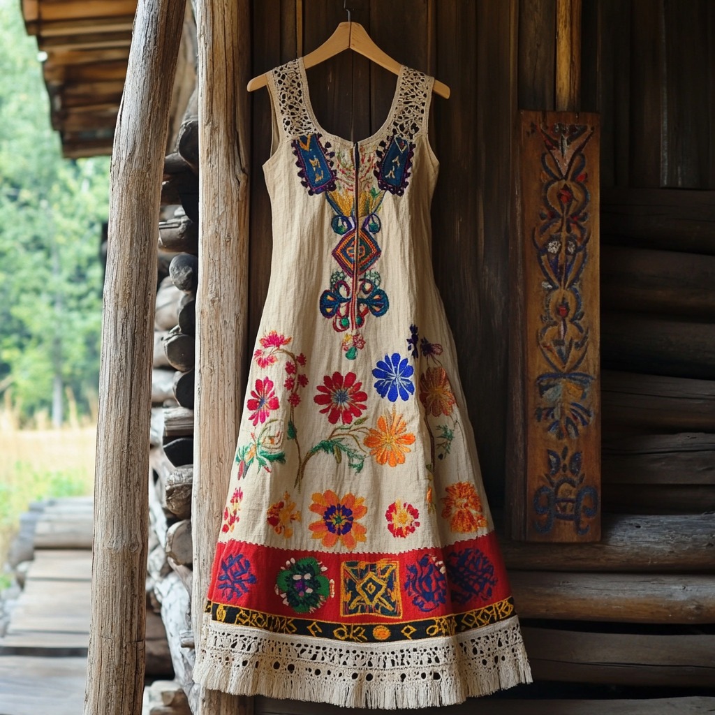 Women's Vintage Floral Embroidery Art Patchwork Dress
